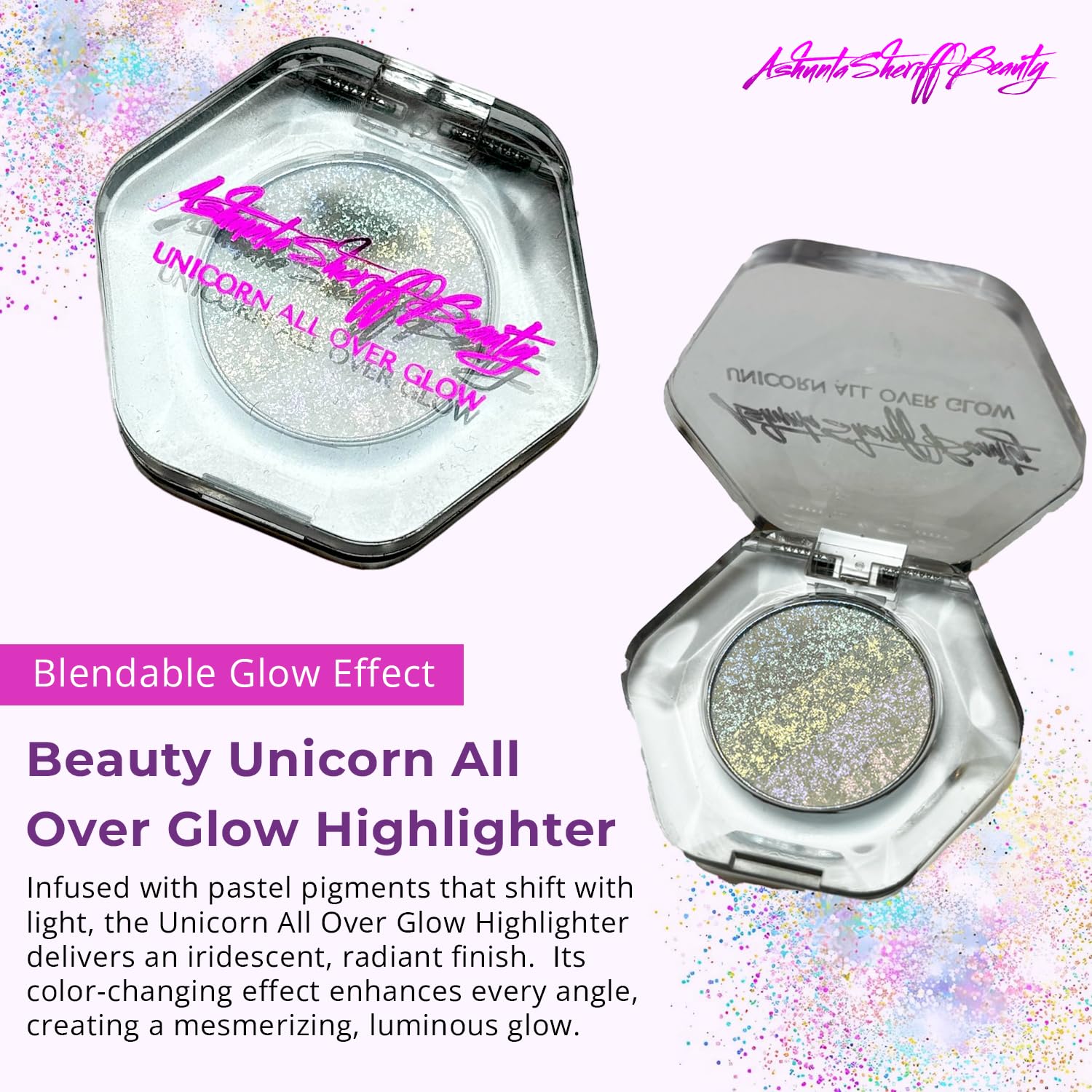 Magical Multi-Chromatic Pigments: Infused with pastel pigments that shift with light, the Unicorn All Over Glow Highlighter delivers an iridescent, radiant finish. Its color-changing effect enhances every angle, creating a mesmerizing, luminous glow.