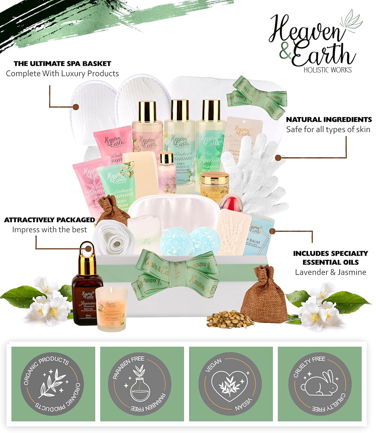 🎁 LAVISH CASHMERE JASMINE – All Inclusive Pampering Spa! From shower gel, bubble bath, shampoo, body lotion, body cream, body scrub, bath oil, bath crystals 2 bath fizzers, bath soap & bath caviar – topped with soy candle, face mask, lip balm, bath sponge, shower mitts, eye mask, comfy waffle slippers & flower sachet all in stunning designer fragrance with essential oil benefits!