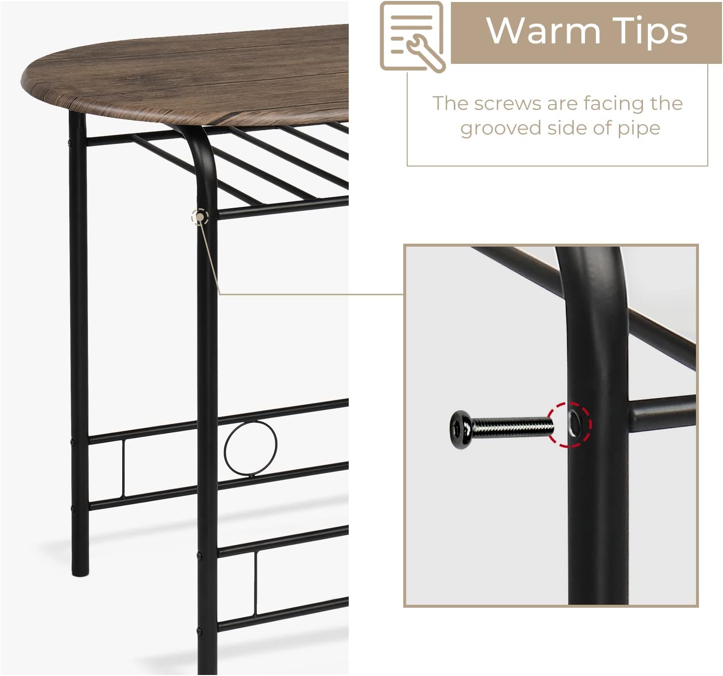 Set includes 1 dining table and 2 chairs.Made of MDF and pvc veneer and metal frame.A wine rack for more storage space.Easy to assemble with instructions provided.