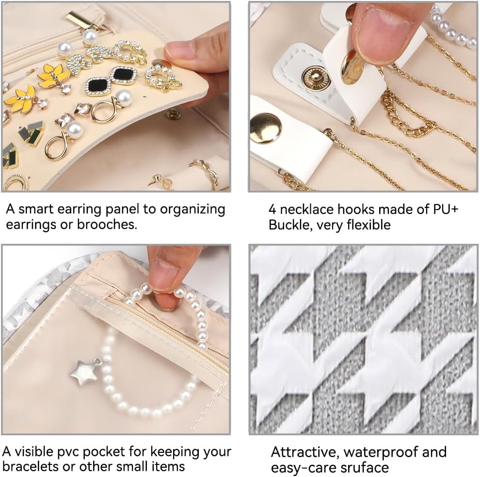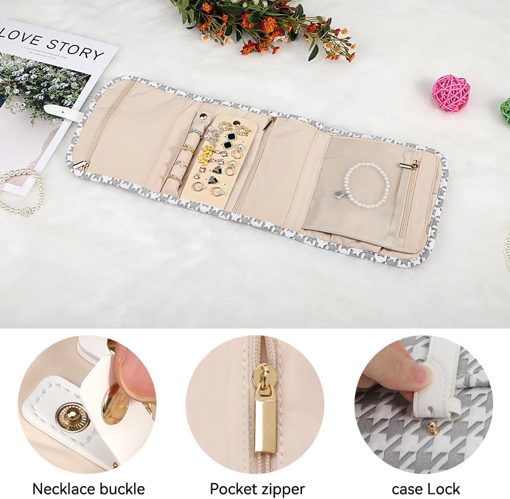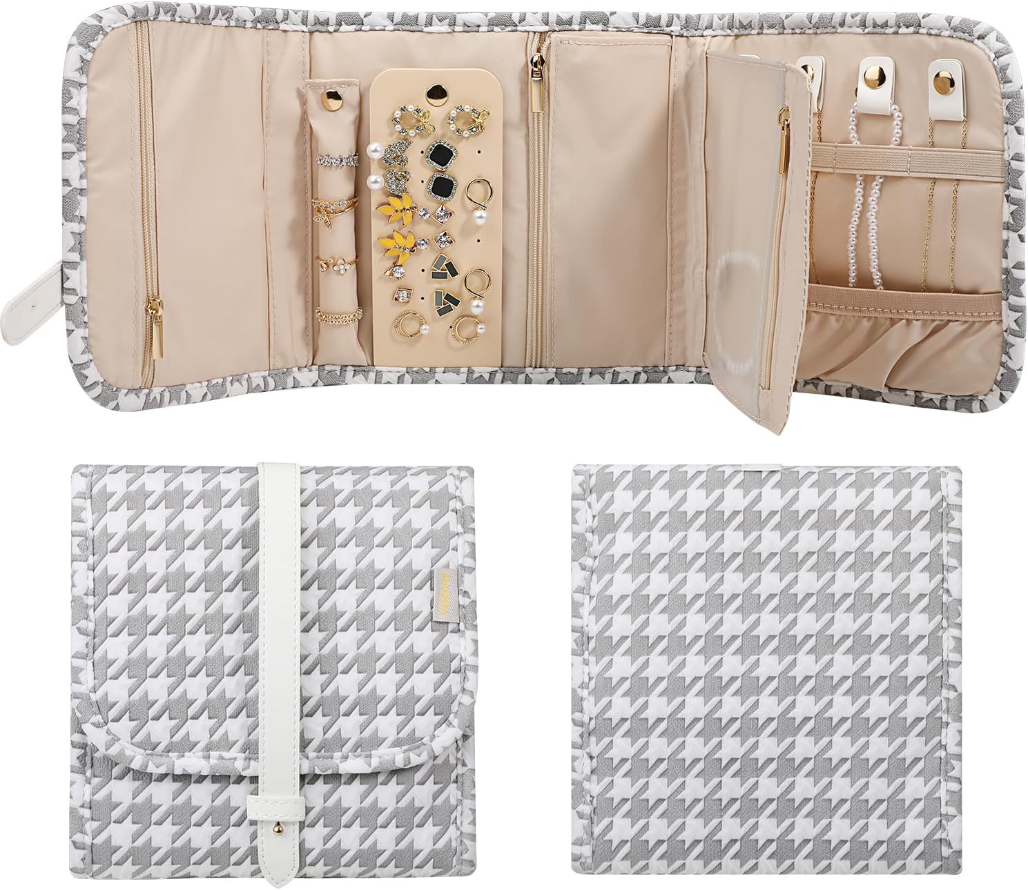 Voova Travel Jewelry Holder Organizer Case, Small Jewelry Storage Bag for Women Girls, Foldable Traveling Jewellery Pouch Roll for Necklaces Rings Earrings Bracelets, Mini, Grey+White