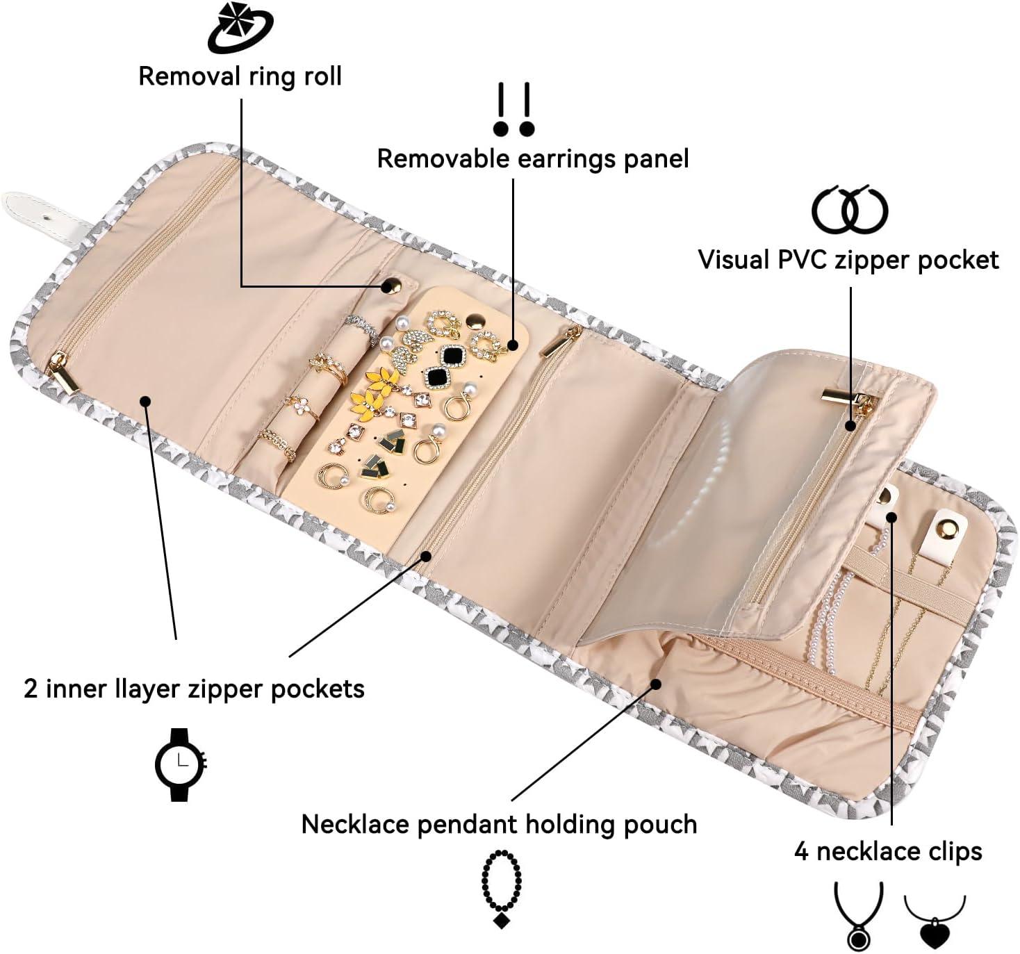 Well Organized: This large jewelry roll bag offer adequate area for your fine jewelry, include 1 ring sticks (detachable) to store rings easily,1 stud board, 1 flared pocket, 1 opaque pocket on the outermost side for privacy items, for Bracelets , cuffs, brooches and other souvenirs.You can visually see all of your travel essentials, makes selection easier,while being space savvy!