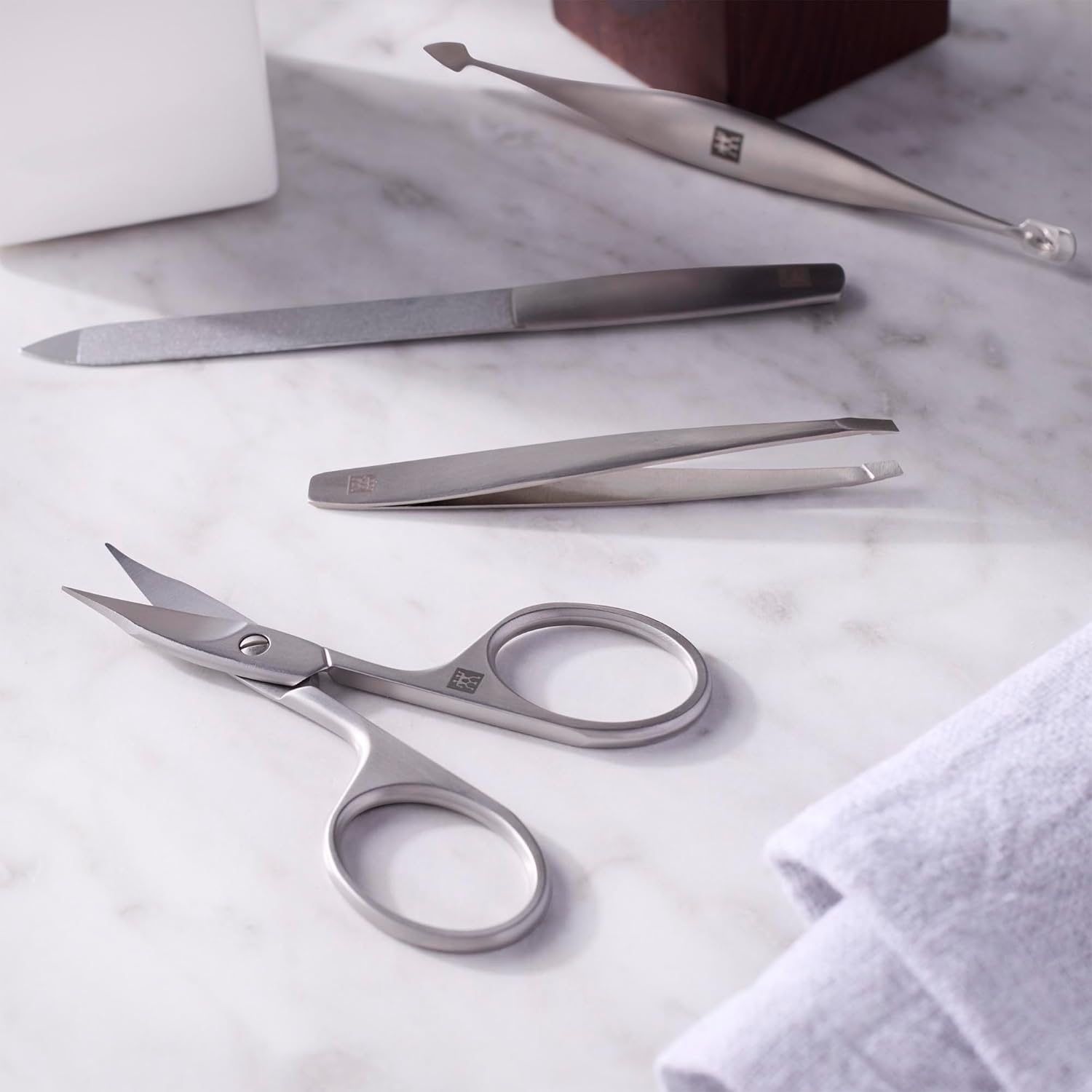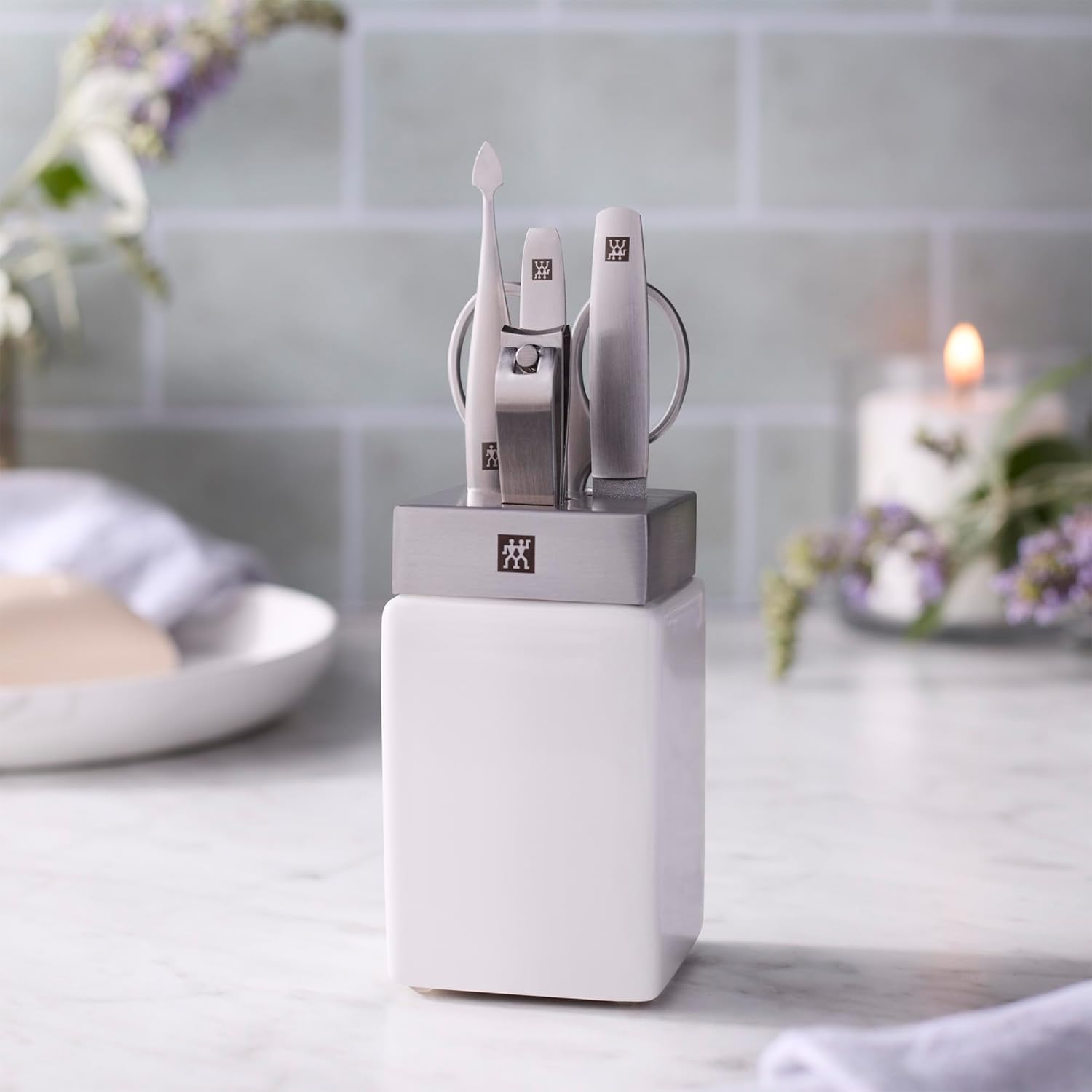 Enjoy salon results at home with our professional-quality and hypoallergenic tool set that will inspire you to talk with your hands. This 6-piece manicure set includes nail clippers, nail and cuticle scissors, sapphire nail file, cuticle pusher and cleaner, and slanted tweezers all housed in a handsome, white ceramic holder for easy organization and storage.Crafted of high-quality, hypoallergenic stainless steel, ZWILLING beauty tools blend clean modern design and unparalleled functionality with long-lasting durability designed to elevate your everyday grooming routine.